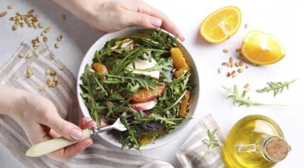 В салатные листья добавьте 2 ст. л. заправки и перемешайте.